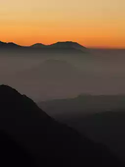 A distant view of bromo and the surrounding surrounding mountains
