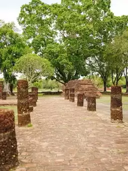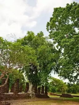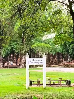 💕 Wat Chang Lom is a very large temple. The temple grounds are surrounded by a moat measuring 100x157 meters. It is located in Sukhothai Historical Park. It is an important and beautiful ancient site. The main chedi is a bell-shaped chedi. The base of the chedi is made in the shape of 32 elephants (stucco in the shape of half an elephant). There is a circumambulation area around it. There is a chapel in front of the chedi. There are surrounding chedis. There is a first layer of glass walls before the moat layer. Outside the moat, to the east, there is a chapel (church) with a separate moat. In front, there is a brick chapel base and a brick wall base.