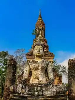 If you want to experience the beauty of early Thai civilization, Wat Mahathat is a must-visit. Located in the heart of Sukhothai Historical Park, Wat Mahathat was the royal temple of the former capital and the center of Buddhism in the Sukhothai Kingdom. Its highlight is the "main lotus bud-shaped chedi," which stands majestically in the temple grounds. Surrounded by over 200 smaller chedis and a majestic Buddha image in the Mara-Vijaya posture, it is a must-see.