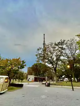 With spacious green spaces and promenades, this urban oasis offers views of Tokyo Skytree. Nearby, there's a cafe and food truck, making it the perfect spot for a stroll or a break.