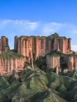 As the only Danxia landform in China named "window-lattice palace-style," the rock layers of Binggou Danxia resemble naturally carved window lattices, displaying a metallic texture of crimson gold and ochre red under the sunlight. The iconic "Louvre Phantom" measures 150 meters wide and 50 meters high, looking like an alien castle floating in the sky from afar, while every fold up close hides geological secrets.