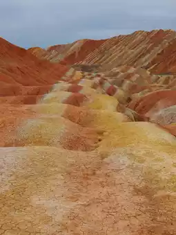In Gansu Province, the Colorful Danxia (七彩丹霞) is a surreal landscape where rolling hills and jagged peaks are splashed with vibrant layers of red, orange, yellow, and even blue. These colors come from millions of years of sandstone and mineral deposits, sculpted by wind and rain into breathtaking shapes.
