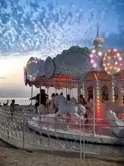 From 6:00–6:45pm, sit on the fine white sand and wait for a grand sunset feast. There will be many decorations on the beach for taking pictures. The golden-edged dolphins really match the sunset. As the sun sets, the beach becomes more and more lively. The large amusement equipment carries the happy laughter of children. How romantic it is to sit on a carousel on the beach. And don't miss the fairy tale world of the 7th Luoma Lake Beach Festival.
