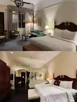 The century-old colonial building has a great sense of history and looks amazing! You can take great photos without even trying! The building is absolutely stunning, with a pure white minimalist symmetrical aesthetic and a fountain in the atrium with towering ancient trees. The interior of the rooms is very retro, and the whole hotel is full of colonial style. The light and shadow during the day and the lights at night create a great atmosphere.