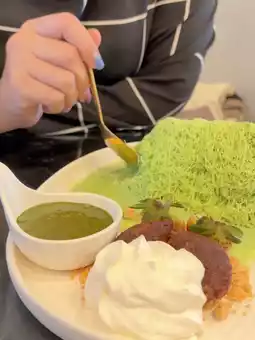 This is ECHO coffee roasters, a famous shop in Surat Thani. Their coffee is second to none. But this place doesn't just have coffee. They also have food and desserts. When we came here, we tried the bingsu menu. The milk bingsu has a well-rounded flavor and is not too sweet. It's very delicious. The kids love it. It comes with Kit Kat and strawberries. As for the matcha bingsu, adults will love it very much. It comes in a strong, not too sweet flavor. It's really delicious.