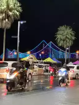 Back to the city Continue playing water at Naris Bridge 💦 There were a lot of people, a long traffic jam along the river. Playing in the water was so refreshing. What I liked was that there were a lot of people playing in the water but there were no fights. It was a beautiful Songkran water festival with a beautiful view, both the view of the City Pillar Shrine and the view of Naris Bridge with beautiful lights, colorful lights, and spectacular water splashing.