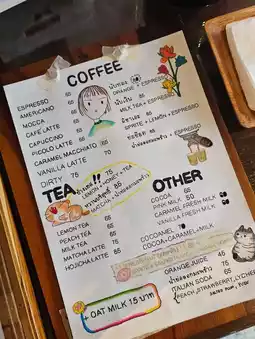 As soon as you step inside, you'll find a cute place to order drinks and food. From the menu, you'll see the thoughtfulness of the owner. He's incredibly nice and gives excellent recommendations. I really like this kind of cafe. It's creative and has cute Thai names.