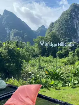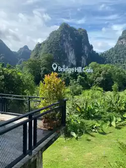 A cafe nestled in a valley with a bridge view, located in Khao Sok ⛰ Surat Thani Province, is so beautiful you can't even drive past it. Stop in for a cup of coffee and enjoy the view. Located right next to the bridge and mountains, just like the name suggests, Bridge Hill 🎶