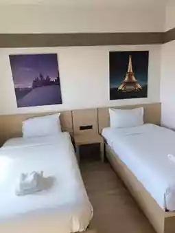 Amenity: The hotel building has a large, clear orange sign. It's not very tall, probably around 7-8 stories. It's spacious and located on a street corner. The rooms are quite spacious and clean, decorated in a modern style, giving it a modern, fresh feel. Amenities include air conditioning, a TV, a refrigerator, a kettle, and a water heater, all standard at B2 hotels. Free Wi-Fi is also provided. There's ample parking for guests. Importantly, the hotel is located in the heart of the city, near the Surat Thani City Pillar Shrine and Sri Tapi Bridge. Surrounding the hotel are shops, restaurants, cafes, and the Tapi River Walking Street, making it very convenient and full of food options. In the evening, we recommend taking a stroll along the Tapi River to enjoy the view. The atmosphere is excellent. This hotel is a great value for money.
