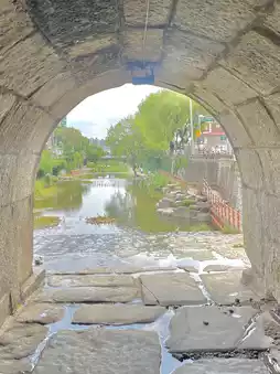 The combination of the flowing water gate, stone bridge, and pavilion is so pretty.