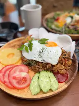 The Gadogado salad was fresh and healthy with a lot of delicious peanut sauce, and the Nasi Goreng was spicy fried rice with a fried egg on top, properly capturing the local Balinese sensibility. The seafood oil pasta was satisfying with the harmony of fresh seafood and clean taste.😍