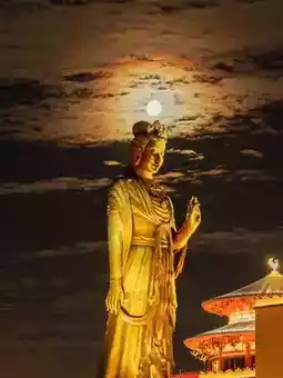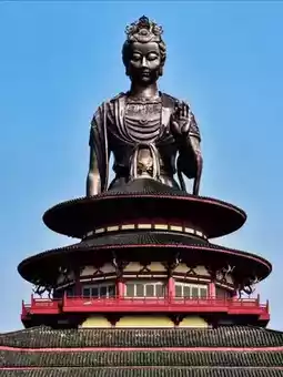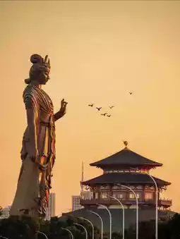 The statue is 75 meters high and stands majestically, looking like a goddess overlooking the earth from a distance. Compared with the Leshan Giant Buddha, it is four meters taller, making every visitor feel a sense of shock and oppression. The design of the statue is inspired by the Tongtian Pagoda in the movie "Detective Dee", combining traditional and modern artistic styles, showing the characteristics of surrealism.