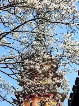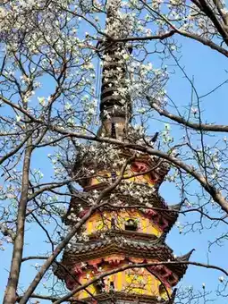 The four tall magnolia trees surrounding the pagodas (visible from outside the temple, Photos 1 and 2) are a highlight. When the magnolias bloom, the blossoms against the blue sky, yellow towers, black tiles, and white walls create an elegant and tranquil scene reminiscent of a traditional Chinese painting (Photos 1–9). When we arrived, the magnolias were past their peak, and fallen white petals covered the tiles (Photos 8 and 9).