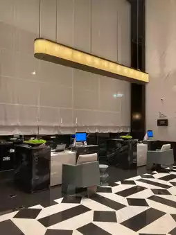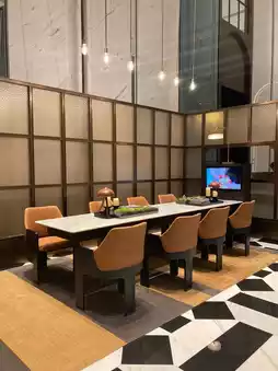 The lobby isn't particularly large, but it has high ceilings and an exquisite design. Many design elements are related to Suzhou, such as the frequent use of Suzhou lattice window patterns and a Taihu stone sculpture at the entrance.