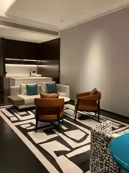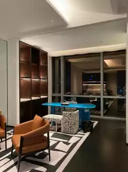 The room has high ceilings and a modern design. The desk in the living room has a bold color scheme, perhaps echoing the blue-green theme of the lobby.