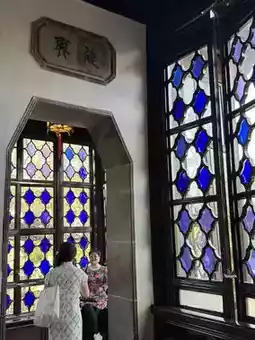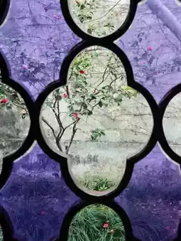 In the western section of Zhuozheng Garden,built in 1509 during the Ming Dynasty and later fragmented among 32 successive owners—stands the ethereal Thirty-Six Mandarin Duck Hall (卅六鸳鸯馆).This rare mandarin duck-style pavilion is split symmetrically into north and south chambers, but its true magic lies in the 19th-century European stained glass that cloaks its windows. Commissioned by Hong Jun,a Qing-dynasty diplomat to Germany, the violet-hued crabapple-patterned panes*transform sunlight into liquid amethyst. As the day progresses, beams of indigo and lavender ripple across the wooden floors, casting the entire space in a dreamlike chromatic glow as if the pavilion itself breathes with the garden’s 500-year history. Here, where Chinese courtyard architecture meets imported glasswork, even dust particles seem to dance like time travelers between dynasties.