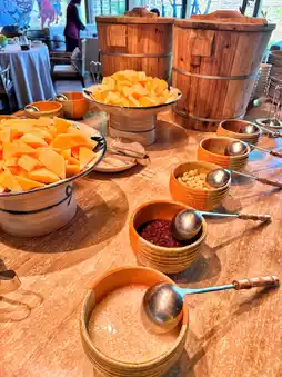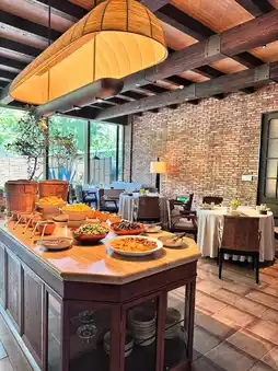 Uncle Rong's farmhouse offers self-serve tofu pudding and fruits, while the kitchen lets you pick ingredients for custom dishes. The resort-like ambiance enhances relaxation, featuring expansive Suzhou-style garden courtyards that embody the poetic charm of Jiangnan water towns, emphasizing a natural and rustic environment. This aligns with Xin Rong Ji's philosophy of authentic flavors and premium ingredients, though Cantonese cuisine surpasses it in culinary techniques.