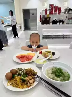 The buffet breakfast is generous, featuring Suzhou-style noodles 🍝, wontons, and tofu pudding—all kid-approved and thoughtful.
