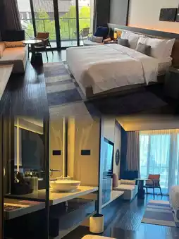 Inspired by the "Eight Scenes of Bamboo Grove," the hotel blends the blank-leaving art of Suzhou gardens with contemporary minimalism. The lobby dome recreates the sunset glow on old city tiles, while the lakeside pavilion retains the original Taihu rockery from Bamboo Grove Hotel, fully showcasing Suzhou's charm.