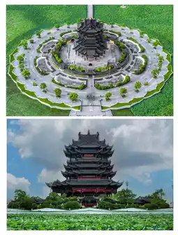 1. Lengjia Pagoda: Drone shots of the "seven-story pagoda amidst autumn foliage."