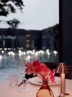 - Facilities: The hotel features 210 guest rooms and suites, plus 11 standalone villas. Amenities include an outdoor infinity pool with lake views, an indoor pool with floor-to-ceiling windows, a spa, a 24-hour fitness center, an indoor playroom, an outdoor children's splash pool, and expansive lakeside gardens covering the entire island.
