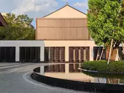 Water View King Room: Floor-to-ceiling windows face the pool, reflecting blue sky, white clouds, and tree shadows inside the room. Lying on the bed watching the moonlight on the water is so romantic it inspires poetry.