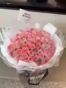 The draped veil at the headboard is adorned with delicate string lights, and the bed is covered in pink and white roses and lisianthus, creating a romantic backdrop. Even the heart-shaped pillows are adorned with heart shapes. The air is filled with a subtle aromatherapy scent, creating a truly captivating atmosphere.