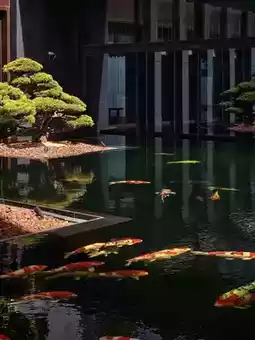 · Courtyard koi pond (perfect for shimmering water + pine tree ambiance)
