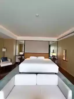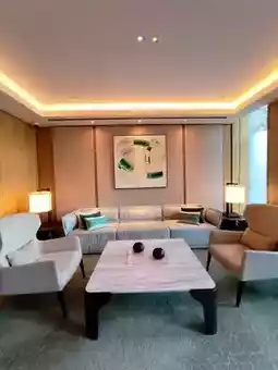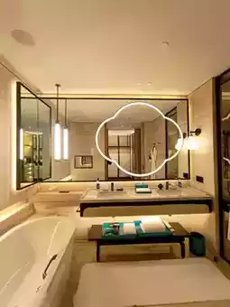 Begonia flowers serve as the design theme throughout the hotel, visible in their exquisite shapes everywhere. The main color tone, peacock blue, imparts a noble and serene atmosphere, with walls extensively clad in Italian Blue Gold Sand marble.