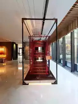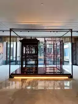The reception area adopts the traditional three-entry layout of a grand residence. The first entry features a transparent roof with a high atrium and a semi-hollow screen, using natural light to create a poetic play of light and shadow. The second entry displays official and wedding sedan chairs, symbolizing continuous promotion and happiness. The third entry is the check-in area, showcasing artworks with Jiangnan charm.