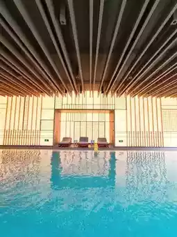 The 25-meter swimming pool is surrounded by gardens, with a glowing wall on the side that presents a jade-like texture.