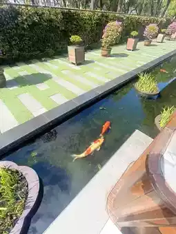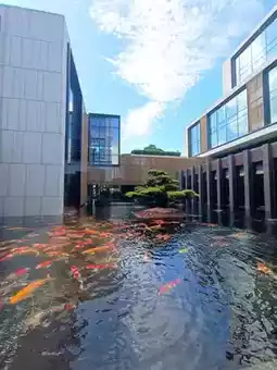 The hotel’s landscape design is equally thoughtful. The koi pond is planted with century-old Japanese black pines, inhabited by koi fish over one meter in length, and features a white horse sculpture, forming a vivid oriental painting.