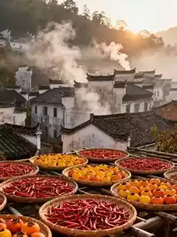 The autumn drying scenes in Huizhou villages are known as a "moving palette." After the autumn equinox, chili peppers and persimmons spread red and yellow blocks on drying racks, contrasting with horse-head walls and black tile eaves. When the morning mist lingers, smoke rises gently, and the colors on the racks appear more vivid in the haze. Paired with the gradually reddening Chinese tallow trees by the village, it fully displays the beauty of agricultural civilization and nature.