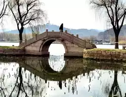 In late autumn, the best place for a stroll is Xingchun Bridge. This single-arch stone bridge reflects in the water like a half moon, forming a full circle with its reflection. The old willow at the bridgehead has lost its green, its gnarled branches silhouetted against the gray-white sky. Occasionally, travelers dressed in plain clothes lean on the railing, like shadows from the Tang poem “Moon sets, crows cry, frost fills the sky.” If there is a fine drizzle, it’s nice to take shelter in the lakeside teahouse, order a pot of Biluochun tea, watch the raindrops embroider ripples on the lake, while the flying eaves of Tianjing Pavilion appear faintly in the mist, evoking the lingering charm of Du Mu’s “Four hundred and eighty temples of the Southern Dynasties.”