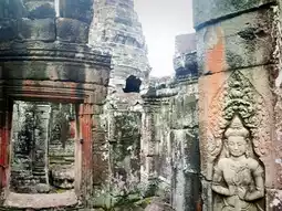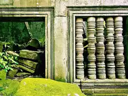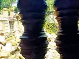 -Hidden carvings: Beneath moss and vines, lintels depict scenes from Hindu epics, though many are now too weathered to decipher.