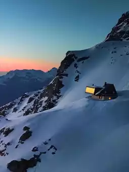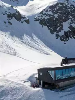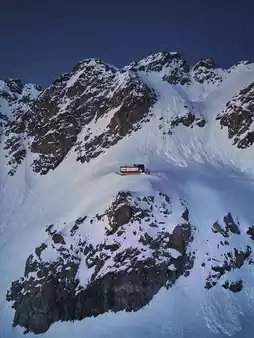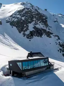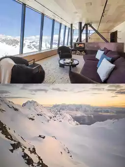 Cabane Tortin is a luxury resort in Verbier, Switzerland, perched alone on a polar glacier slope at an altitude of 3,000 meters, offering stunning views and a sense of tranquil solitude.