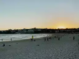 As the sun dips below the horizon, Bondi Beach glows in golden hues, with palm trees swaying against a pastel sky. The laid-back vibes set the scene as surfers catch the last waves and joggers breeze along the coastal walk. Nearby, trendy shops and restaurants buzz with energy, serving fresh seafood and Aussie classics. A perfect evening in Sydney’s most iconic beach spot! #australiatrip