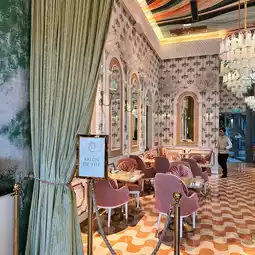 The interior, decorated with pink velvet chairs and pastel wallpaper, exudes a truly feminine and romantic atmosphere.