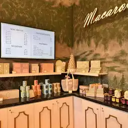 On one side of the store, a showcase displays macarons and desserts, while on the other, a coffee and tea bar is located. The separate Salon de Thé offers a relaxing and quiet tea time.