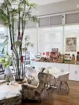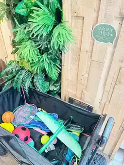 There is a park in front of you, badminton rackets for rent, toys and placemats for parents and children to have fun together