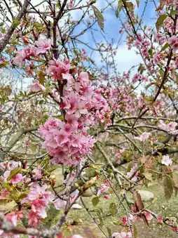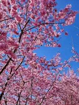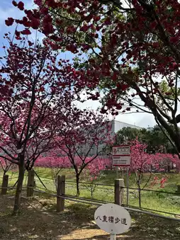 The spring breeze is slightly cool as I travel along the winding mountain road to Wuling Farm in Taichung. It's the peak of cherry blossom season, and the entire valley seems to be covered in a layer of pink and white clouds. From a distance, the mountains are adorned with layers of pale pink cherry blossoms swaying gracefully under the blue sky, creating a stunning contrast with the lush green pines and cypresses. This picturesque spring scene is like a beautiful painting. Walking along the cherry blossom trail, a gentle breeze blows, causing the petals to fall like snowflakes, covering the path. It feels like being in a dream. Travelers stop to take photos or sit quietly under the trees, soaking in the tranquility and poetry that nature offers. I slowly make my way to Taoshan Waterfall, where the flowing water reflects the cherry blossoms, sparkling like a moving spring. In the afternoon, sunlight filters through the flowers, casting colorful shadows, and a few birds fly over the treetops, adding a touch of liveliness to this serene pink world. As the mountain mist rises, it envelops the cherry blossoms in a hazy veil, resembling an ink painting of a spring scene. The afterglow of the sunset illuminates the sea of flowers, and as I look back at this cherry blossom paradise, my heart is filled with the lingering charm and reluctance of spring.