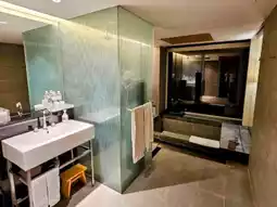We stayed in a superior double room which cost 6,000 yuan a night, and it was actually a corner room. The L-shaped floor-to-ceiling window was large and comfortable. It was so enjoyable to lie on the bed and watch the night view! The room is 53 square meters in size and has a separate hot spring bathtub. It also has a view, which is a plus.