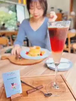 The drink we pair with it is the gold medalist of the Asian Creative Coffee Competition - Azalea. It uses Taiwan's specialty Roselle tea and white peach as the base, combined with espresso, and visually presents a beautiful orange-gold tone, just like the beauty of the sunset. Remember to stir it and then taste it after taking pictures. The sweet white peach and slightly sour Roselle have a sour and sweet taste, and the aftertaste has a rich coffee aroma and sweetness. Even people who don't drink coffee will fall in love with it!