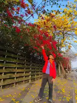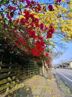 On the way to Guguan, the contrasting colors of the yellow-flowered golden trumpet trees and bougainvillea are particularly eye-catching. We even stopped the car to take some beautiful photos.