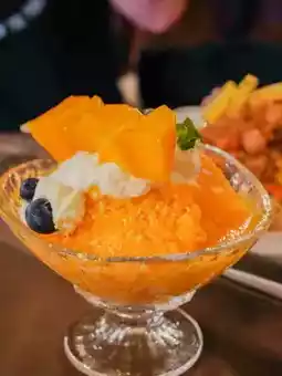 Featuring thick slices of mango, the shaved ice underneath is smooth and creamy,