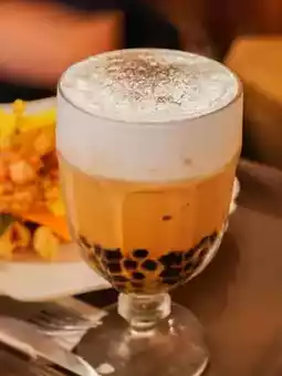 it blends the rich aroma of milk tea with chewy brown sugar pearls.