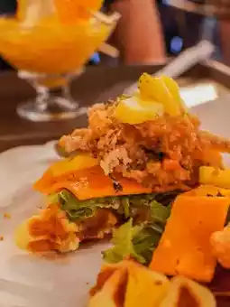 Crispy waffles topped with cheese, fried squid, and pineapple salsa sauce,