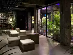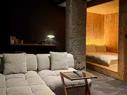 Crossing the street, you open the door and enter the first-floor lobby, where you'll be greeted by a patio and green garden. The furnishings and space planning in the room are unique, very different from ordinary hotels. The uneven chiseled walls and beams, the greenery, and the sunlight that streams in from outside enhance the space. The stay experience is full of surprises.