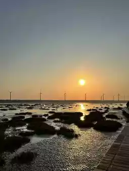 The long wooden boardwalk allows visitors to walk far into the wetlands, surrounded by the whispers of wind, seabirds in flight, and the iconic row of wind turbines spinning slowly in the distance. As daylight fades, the golden glow bathes everything in warmth and silence—turning the entire landscape into a dream.