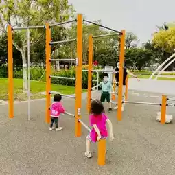 The sandpit is also a huge hit; you can easily spend half an hour playing there. There are also plenty of fitness facilities. It's like a little Spartan training ground. There's even a wheelchair-accessible swing.